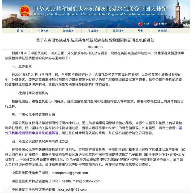 8月21日起英国飞中国(无论直飞还是中转),都要核酸检测证明了。